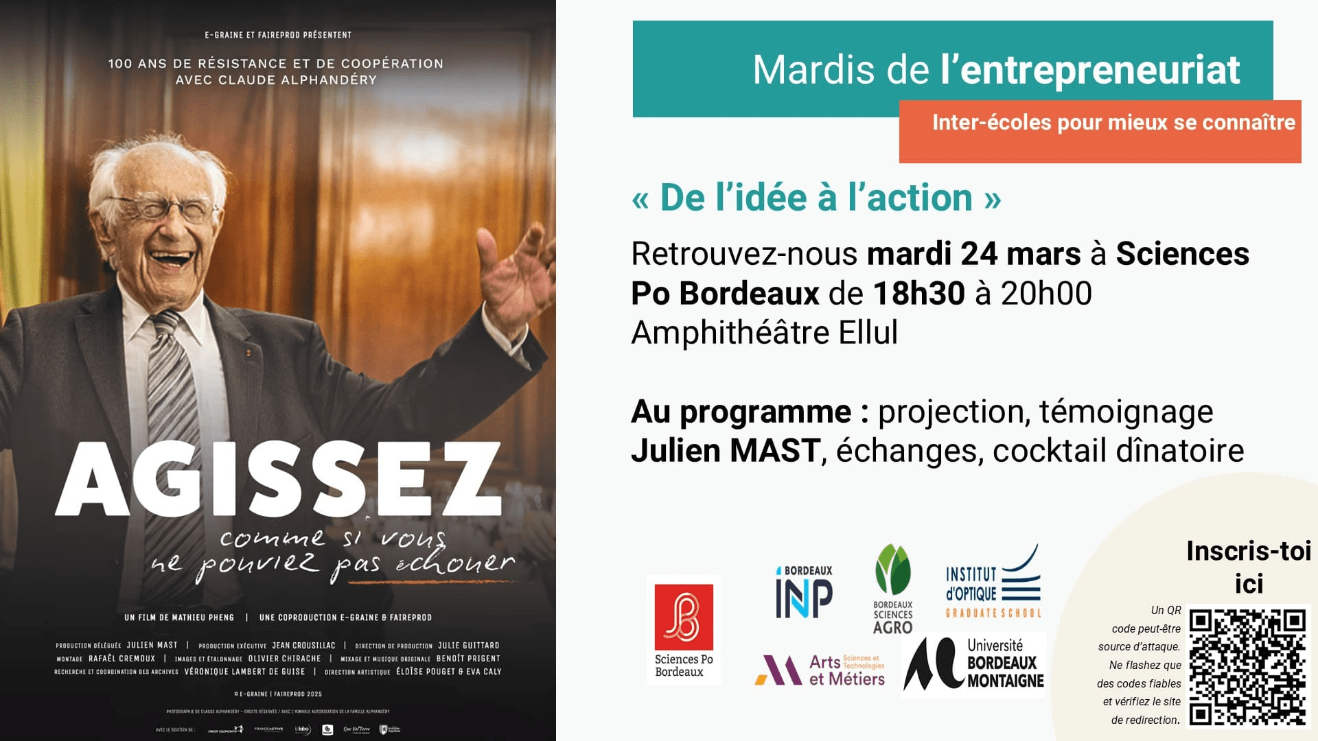 Nous espérons vous retrouver nombreux pour cette soirée organisée par Sciences Po Bordeaux, INP, ENSAM, Institut Optique, Bordeaux Montaigne, Bordeaux Sciences Agro, dans le cadre des « Mardis de l’entrepreneuriat ».